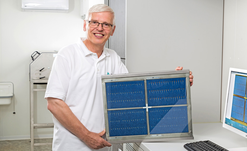 Dr. Ulf Feuerstein, Head of the Asendorf Research Station, presents a method for determining root length.