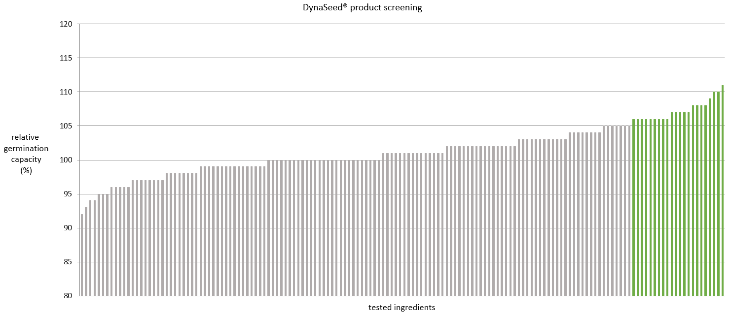 At the end of all tests is the data evaluation. Only ingredients with a significant positive result are considered for DynaSeed product development. Shown below is an exemplary result from the DynaSeed product screening of individual ingredients based on the parameter relative germination capacity (untreated control = 100%). These ingredients were then intelligently combined in our DynaSeed products.