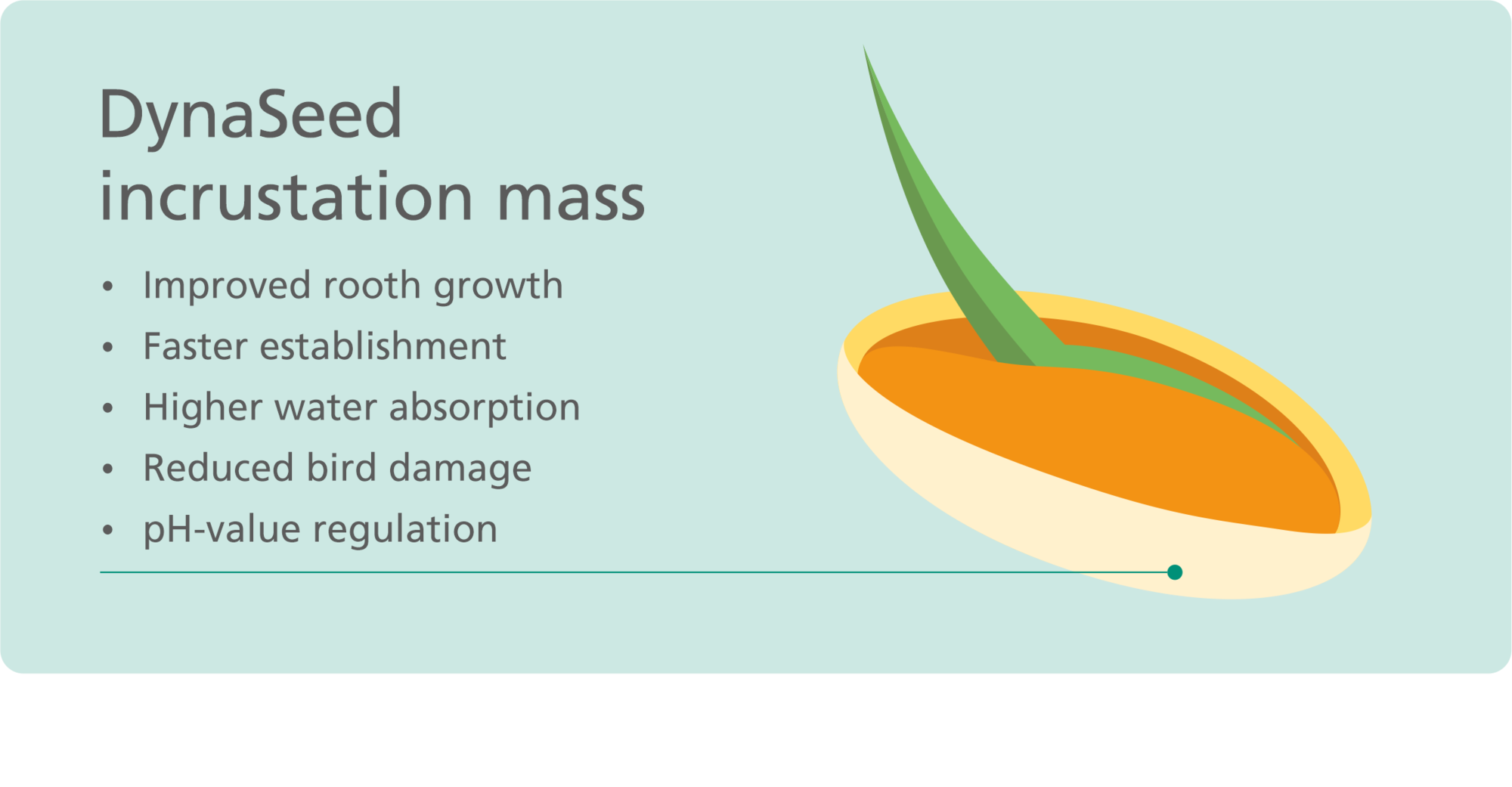 The DynaSeed incrustation is the basis of all our DynaSeed products. It contains important nutrients as well as fillers and is sealed with a layer of colour pigments. Intelligently combined with biostimulants and other nutrients, this results in our DynaSeed products.