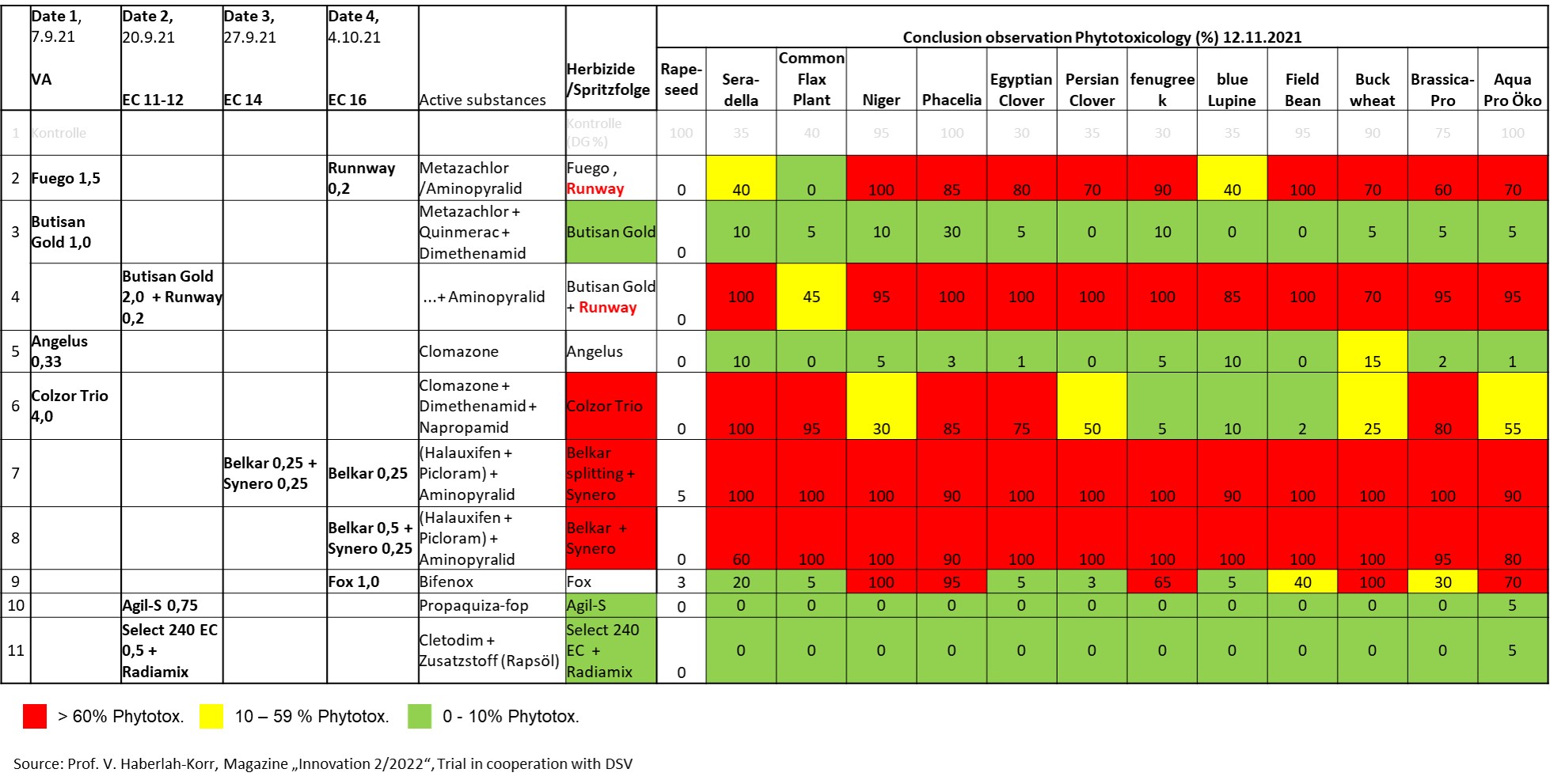 The use of herbicides is also possible in companion crops. To minimise damage to the companion crop, a closer look should be taken at the herbicide used. The table shows the phytotoxicology of individual plant protection products/active substances on exemplary companion crop components.