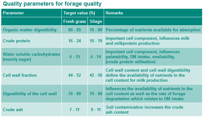 The forage quality of grasses is determined by different factors, which as a whole influence palatability, digestibility and nutritive value of fresh grass or silage. High forage quality has influence on Silage making. Cell wall digestibility (DNDF) and sugar content also play a major role in silage making. The ensiling process is based on exclusion of air (anaerobic environment) and acidification. Lactic acid bacteria convert sugar to lactic acid. The cell wall structure strongly determines the availability of sugar for lactic acid bacteria. When the cell wall is highly digestible, the cell wall is easily degraded and sugar in the cell contents can be easily reached by lactic acid bacteria. A high sugar content stimulates an ideal lactic acid fermentation, resulting in a rapid pH reduction and consequently a high storage stability.