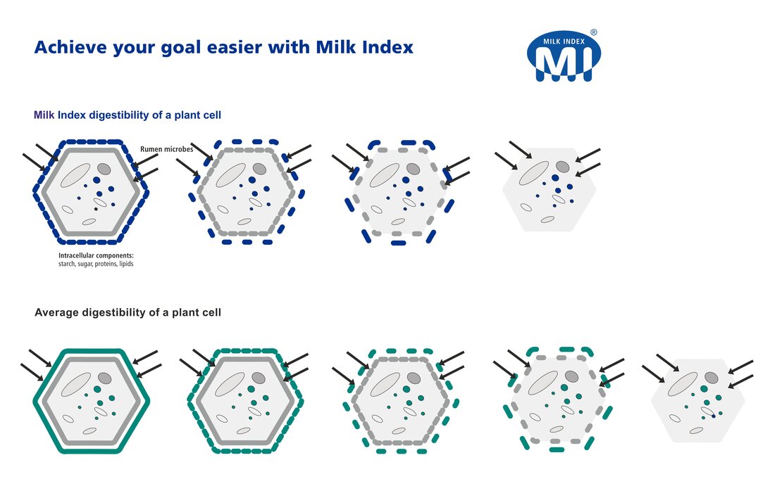 The digestibility of the remaining plant is determined by the cell components (especially sugar) and the fibre digestibility of the cell walls. The share of cell walls of grass is up to 60 % of the total plant, modern maize hybrids contain approximately 45 % cell wall fractions. While in conventional varieties, the indigestible cell wall component lignin („mechanical pulp“) encloses the valuable digestible fibres, in the highly digestible DSV Milk Index varieties this barrier has been broken up by an optimised lignin structure. Reducing the amount of indigestible lignin results in a higher digestibility. As shown in the figure below less steps and less time is needed to digest the cell walls. Thus, the way of digestive bacteria is faster open to the valuable fibres, sugars, proteins, minerals etc. and the absorption of energy from the basic ration increases.
