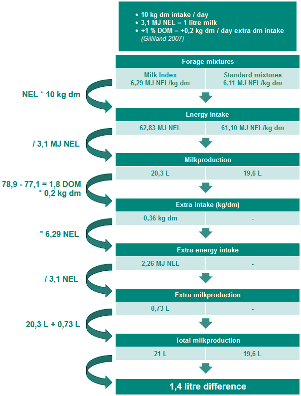 A part of this milk production is based on the higher energy content of the Milk Index mixtures. This results in a difference of 20.3-19.6 = 0.7 litre milk per day. Due to the higher feed intake because of the higher DOM the cow takes up 0.36 kg dm extra per day, resulting in an extra 0.73 litre more milk.