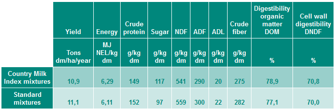Several Milk Index mixtures were compared to common standard mixtures. For both, the Milk Index and the standard mixtures, all used varieties were on the recommended list in the Netherlands. The only difference is that the Milk Index mixtures consist of a high percentage of Milk Index varieties compared to standard mixtures.