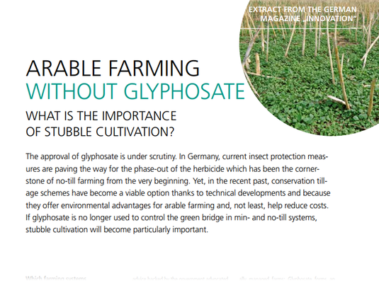 The approval of glyphosate is under scrutiny. In Germany, current insect protection measures are paving the way for the phase-out of the herbicide which has been the cornerstone of no-till farming from the very beginning. Yet, in the recent past, conservation tillage schemes have become a viable option thanks to technical developments and because they offer environmental advantages for arable farming and, not least, help reduce costs. If glyphosate is no longer used to control the green bridge in min- and no-till systems, stubble cultivation will become particularly important.